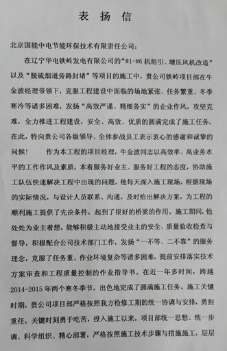 當前位置: 國能中電公司動態> 公司遼寧華電鐵嶺EPC項目受業主表揚